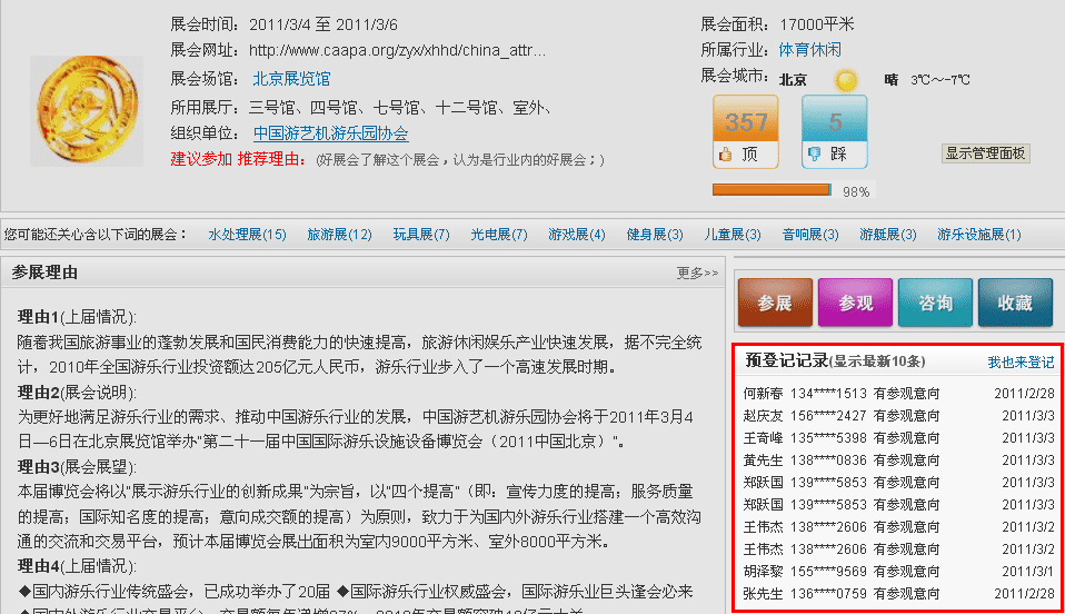 觀眾和展商在瀏覽你的展會(huì)時(shí),可以點(diǎn)擊“我要參觀”、“我要參展”、“我要咨詢”,他們的信息將在頁面上有所顯示: