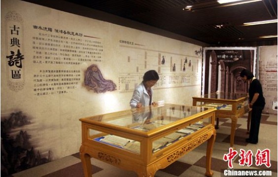 5月6日,臺(tái)灣圖書館舉辦尋找春天的詩蹤展覽。展出包括館藏珍貴中國古詩線裝書在內(nèi)的展品。圖為民眾在觀看古詩線裝書展柜。(來源:中新網(wǎng))