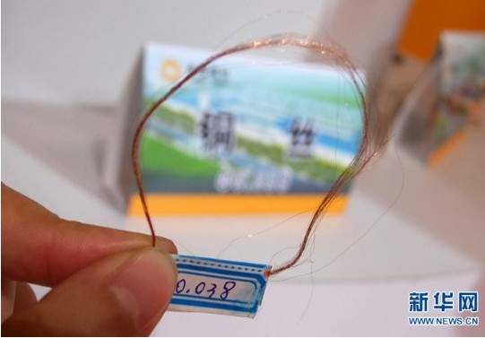 5月11日,記者在展會(huì)現(xiàn)場(chǎng)看到的山東某展商帶來(lái)的直徑為0.038mm的雙零線,這種銅絲廣泛用于手機(jī)震動(dòng)器和軍工產(chǎn)品,其直徑比頭發(fā)絲還細(xì)。(來(lái)源:新華網(wǎng))
