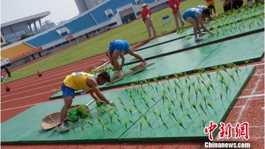 5月17日,廣西第七屆農(nóng)民運(yùn)動會呈現(xiàn)出“農(nóng)忙”景象。當(dāng)日,插秧比賽在柳州市體育中心進(jìn)行,農(nóng)民運(yùn)動員在比賽中不僅需要比拼耐力,還要比拼技巧和速度。(來源:中新網(wǎng))