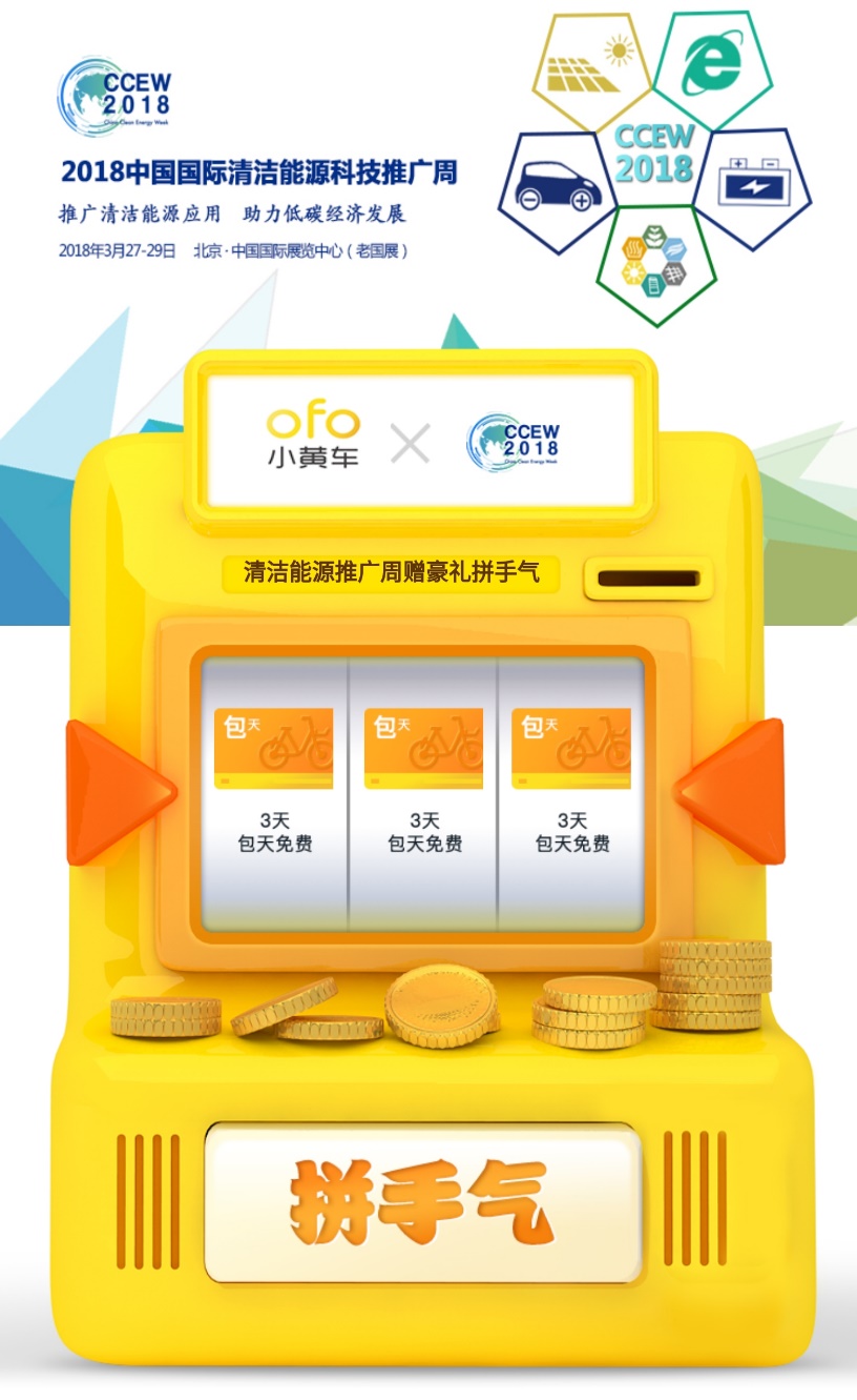 熟悉小黃車的用戶都知道,月卡和騎行券一直是ofo的固定福利模式,而全新上線的手氣卡,則將ofo的福利資源進行了全面整合。手氣卡是一個包含月卡、周卡、騎行券、折扣券等多重優(yōu)惠福利的大禮包,用戶通過老虎機搖獎即可隨機獲得不同種類的優(yōu)惠獎品。參與2018中國國際清潔能源科技推廣周與ofo小黃車聯(lián)名手氣卡的方式非常簡單,活動期內(nèi),用戶可通過推廣周官方微博、微信、EDM等平臺找到活動消息: