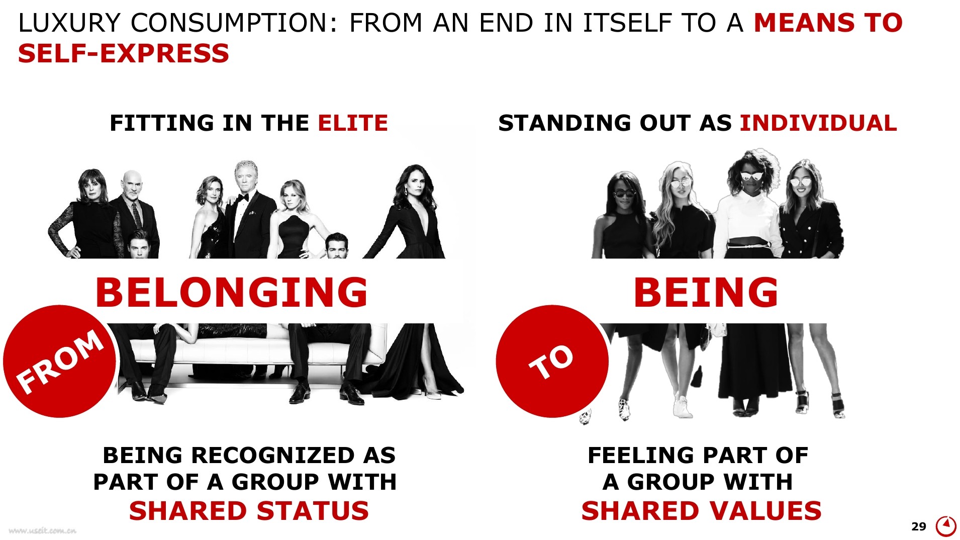 不同于上幾代購買者的炫耀性消費,伴隨互聯(lián)網(wǎng)和數(shù)字化的發(fā)展,千禧一代天然對奢侈品的認(rèn)知度高,有自己對品牌的理解和對時尚的看法。“時尚”、“新潮”、“個性化”、“當(dāng)季“是對奢侈品應(yīng)被賦予全新定義。諸多奢侈品牌為適宜消費人群的轉(zhuǎn)變,對自身品牌進行重新定位。奢侈品市場逐漸也向多元化、多樣化、個性化的方向發(fā)展。