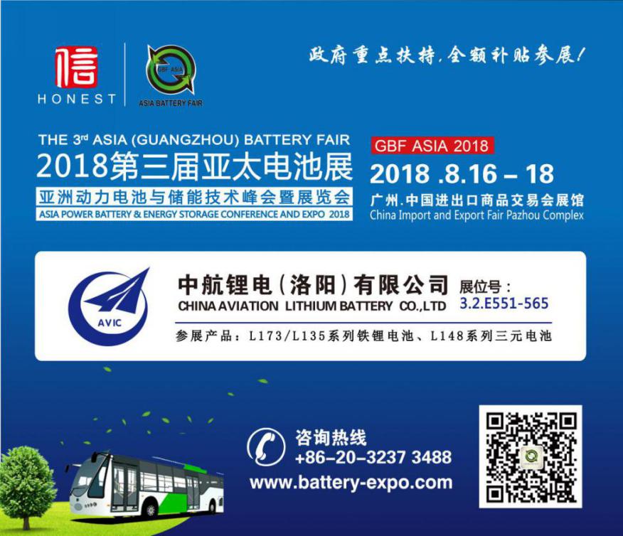 第三屆亞太電池展、亞洲動(dòng)力電池與儲(chǔ)能技術(shù)峰會(huì)(GBF ASIA 2018)于8月16日-18日在廣州琶洲·廣交會(huì)展館A區(qū)舉辦,中航鋰電(洛陽)有限公司(下稱“中航鋰電”)攜公司產(chǎn)品以支持單位身份隆重亮相。