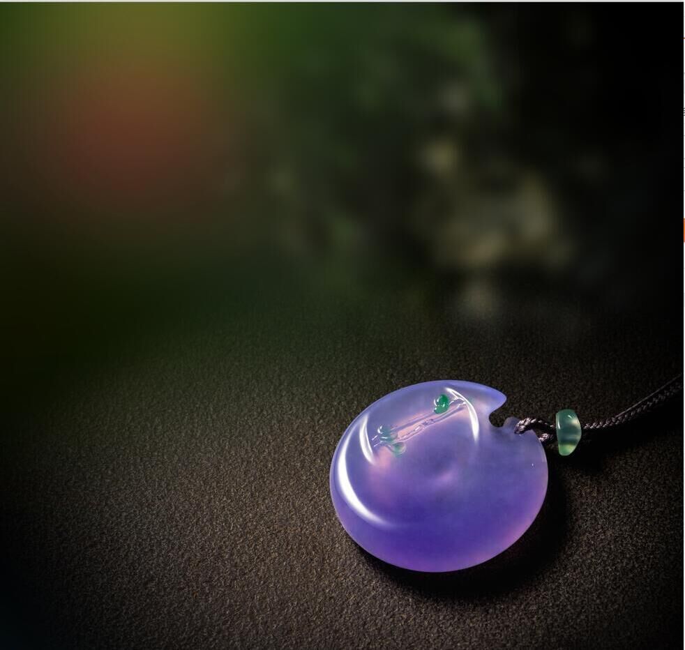紫羅蘭翡翠平安扣左上方有綠色點(diǎn)綴,俏色雕刻,營(yíng)造出一種靜謐的境界。紫與綠相伴相隨,任時(shí)光荏苒,不離不棄。從作品中感受生活、記憶、片段……透過(guò)這件作品想到人生中的點(diǎn)點(diǎn)滴滴。