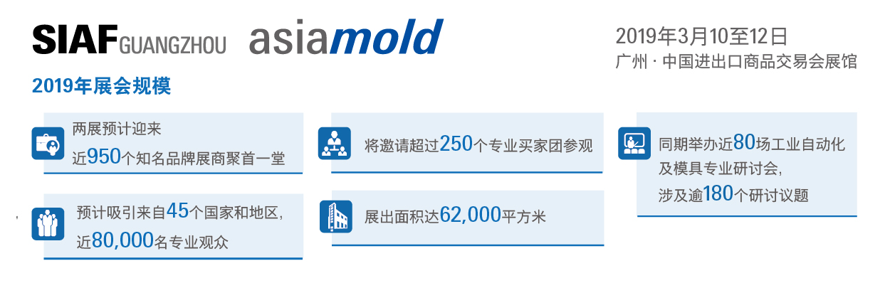 第十三屆廣州國際模具展覽會(Asiamold)于2019年3月10至12日再度在廣州中國進出口商品交易會展館舉行,聯(lián)手SIAF廣州國際工業(yè)自動化技術(shù)及裝備展覽會,兩展將共同展示貫穿從模具、3D打印、智能制造,到生產(chǎn)自動化的工業(yè)生產(chǎn)鏈,助力業(yè)界開拓“中國制造2025”戰(zhàn)略所帶來的龐大商機。。
