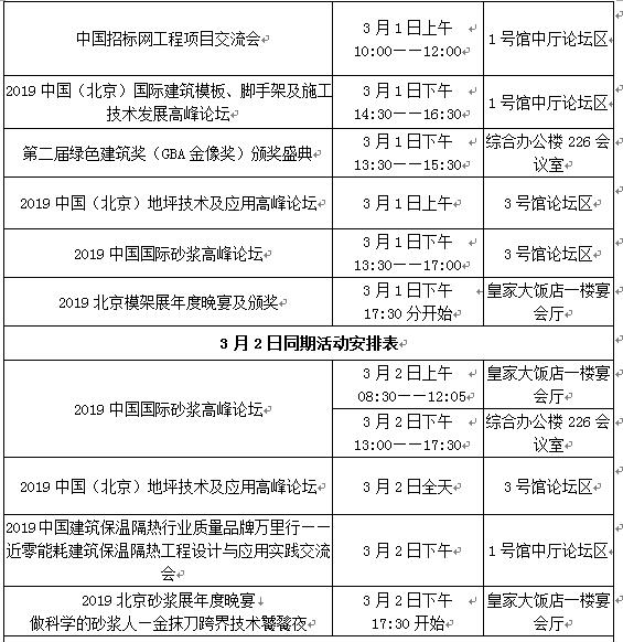 ConstrucTech 2019建筑四新展召開期間還將舉辦多場行業(yè)活動,包括:2019中國模板腳手架產(chǎn)業(yè)發(fā)展峰會、中國砂漿周系列峰會、2019中國地坪技術(shù)與應(yīng)用論壇、2019中國建筑保溫隔熱行業(yè)質(zhì)量品牌萬里行——近零能耗建筑保溫隔熱工程設(shè)計與應(yīng)用實踐交流會、現(xiàn)場施工演示會、工程項目交流會、第二屆綠色建筑獎(GBA金像獎)頒獎盛典、2019北京模架展年度晚宴、2019北京砂漿展年度晚宴、ConstrucTech建筑師設(shè)計師對話等近10余場活動。同期活動安排如下: