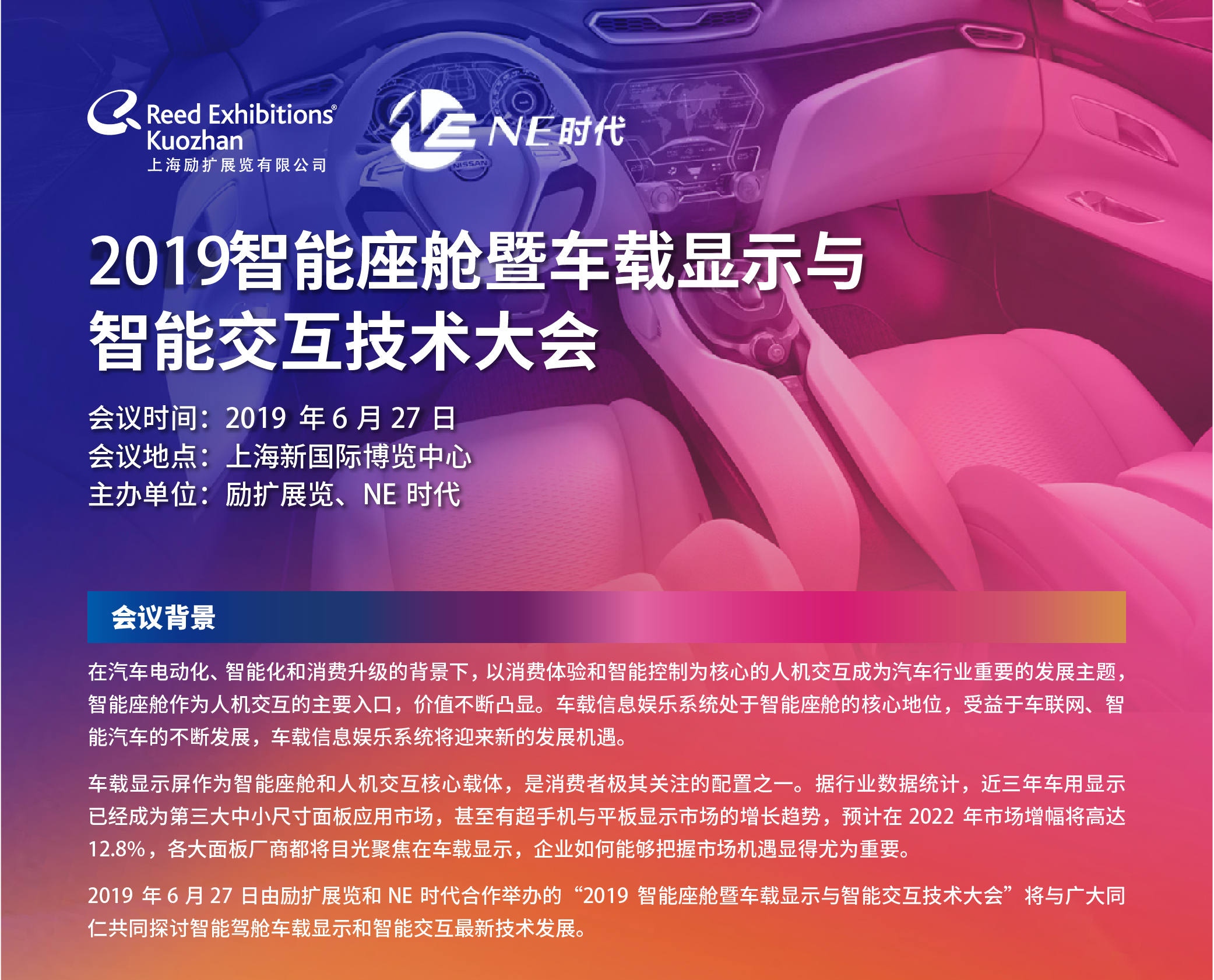 導語:2019年6月27日,勵擴展覽和NE時代將合作舉辦“2019智能座艙暨車載顯示與智能交互技術大會”系列活動將在2019國際新型顯示技術展現(xiàn)場隆重舉辦。本次系列活動立足于智能座艙高速發(fā)展的風口,圍繞智能表面技術、車載顯示、智能交互等熱點話題,與廣大同仁共同探討業(yè)內最新技術發(fā)展趨勢,探索行業(yè)發(fā)展未來。