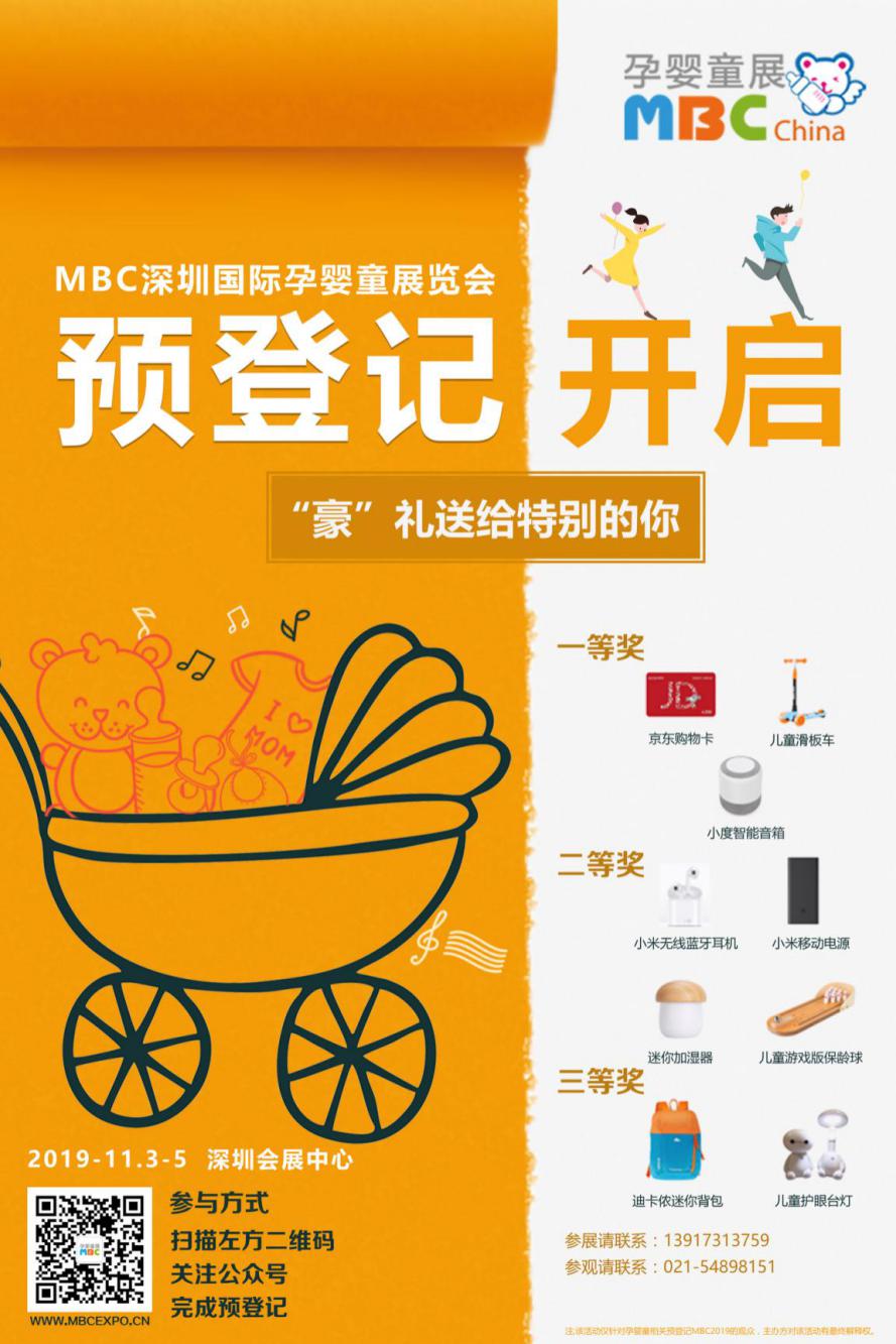 今日,告訴大家一個好消息:2019 深圳國際孕嬰童用品展覽會(簡稱:MBC深圳孕嬰童展)線上預(yù)登記抽獎活動提前開始啦!在原有的一月一次抽獎的基礎(chǔ)上,再增加一次抽獎活動,也就是說本月的18號,將進(jìn)行抽獎活動。