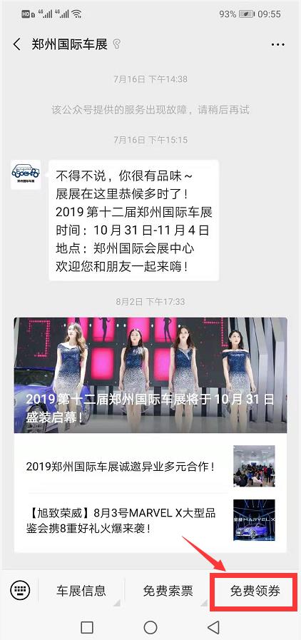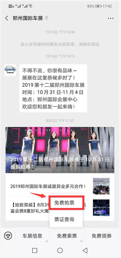 1、關(guān)注“鄭州國(guó)際車展”官方微信,選擇菜單欄“免費(fèi)索票”,點(diǎn)擊“免費(fèi)搶票”;