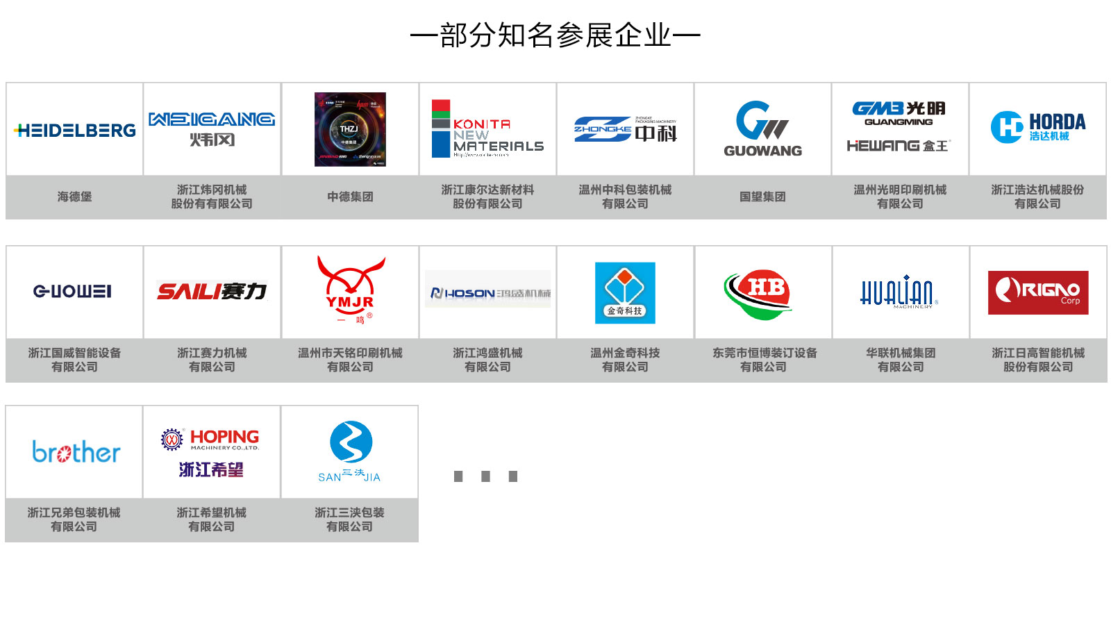 展會依托溫州——“中國印刷城”、“中國包裝機械城”、“中國印刷材料交易中心”、“中國印刷設(shè)備制造業(yè)第一區(qū)域品牌”、全球優(yōu)質(zhì)制造商聚集地產(chǎn)業(yè)高地優(yōu)勢和強勁的市場需求,吸引國內(nèi)外知名企業(yè)、品牌參展,展會展出產(chǎn)品涵蓋印刷、包裝、廣告標識、數(shù)碼印花、圖文快印等品類。海德堡、煒岡、中德、康爾達、中科、國望、光明、浩達、國威、賽力、天銘等印刷行業(yè)龍頭企業(yè)悉數(shù)參與展會;“智能包裝產(chǎn)業(yè)技術(shù)聯(lián)盟”成員華聯(lián)、日高、希望以及兄弟、三浹等包裝設(shè)備知名企業(yè)將攜新品展出;此外,博印、金奇、明睿等數(shù)碼印花、圖文快印、廣告標識企業(yè)也將共襄盛會。