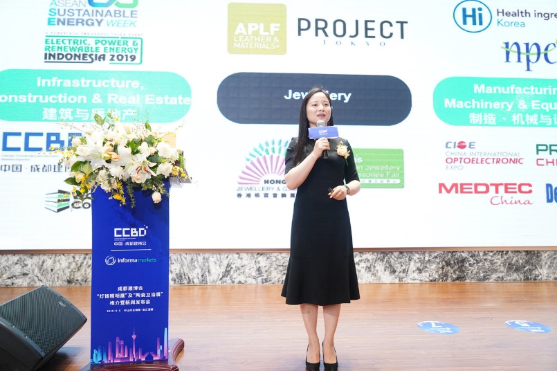 發(fā)布會首先由英富曼Informa Markets中國董事總經(jīng)理龔康康發(fā)表致辭,她指出,成都建博會與英富曼集團牽手已經(jīng)三年了,無論是從展會的規(guī)模還是影響力上都獲得很大的提升。這次我們與中國建筑材料流通協(xié)會共同打造“燈飾照明”和“陶瓷衛(wèi)浴”兩個全新的板塊,相信一定能讓成都建博會如虎添翼,不僅保持在中西部首屈一指的地位,也將成為在全國極具影響力的重點品牌展會。