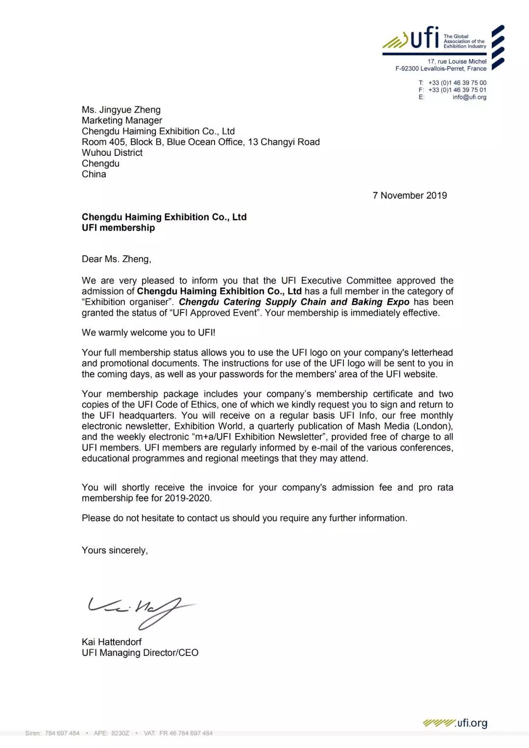 2019年11月7日,UFI(國際展覽業(yè)協(xié)會)巴黎總部傳來喜訊:海名成都餐飲供應(yīng)鏈及烘焙博覽會正式通過UFI認(rèn)證,展會主辦方成都海名會展有限公司通過UFI評審委員會的表決,正式成為UFI會員單位。