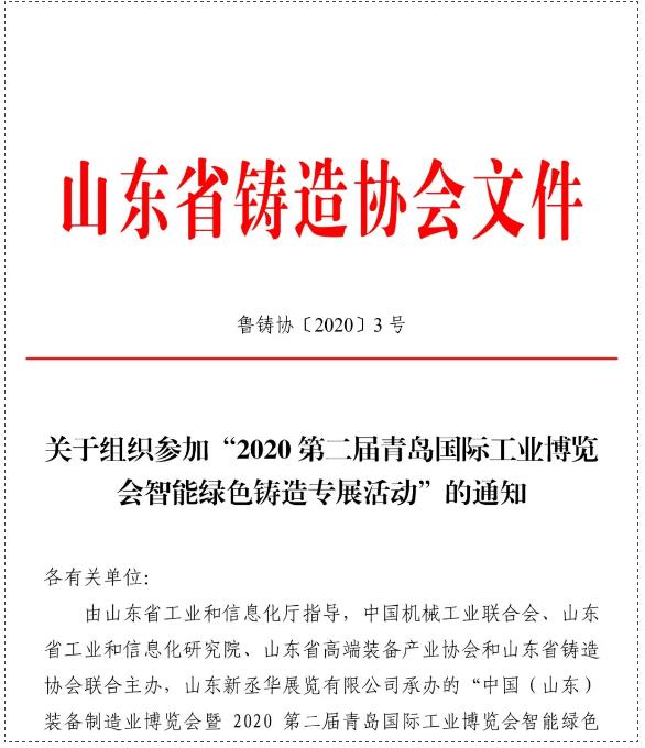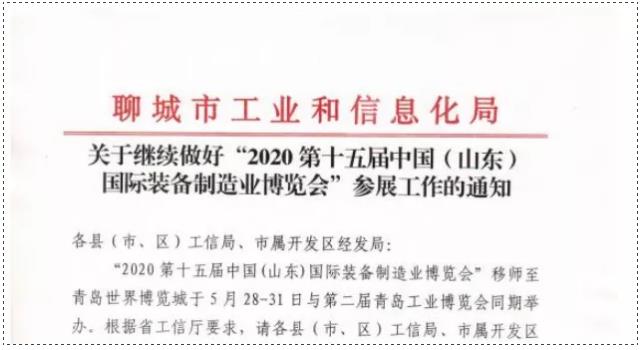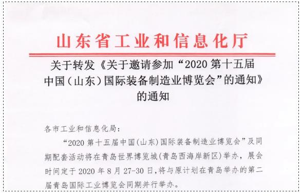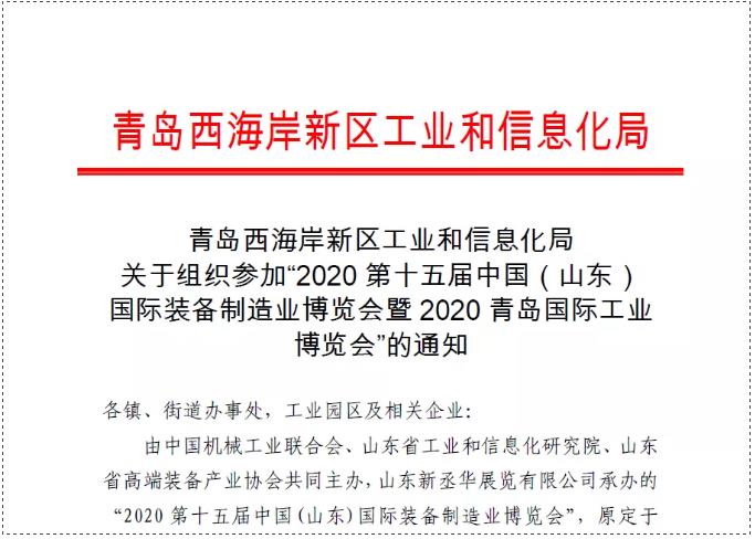 因受新冠肺炎疫情影響,原定于2020年2月14-17日在山東國際會展中心(濟(jì)南市槐蔭區(qū))舉辦的“2020第十五屆中國 (山東)國際裝備制造業(yè)博覽會”及同期配套活動(dòng)整體移師至青島世界博覽城(青島西海岸新區(qū)),與2020第二屆青島國際工業(yè)博覽會同期舉辦,展會時(shí)間定于2020年8月27-30日。