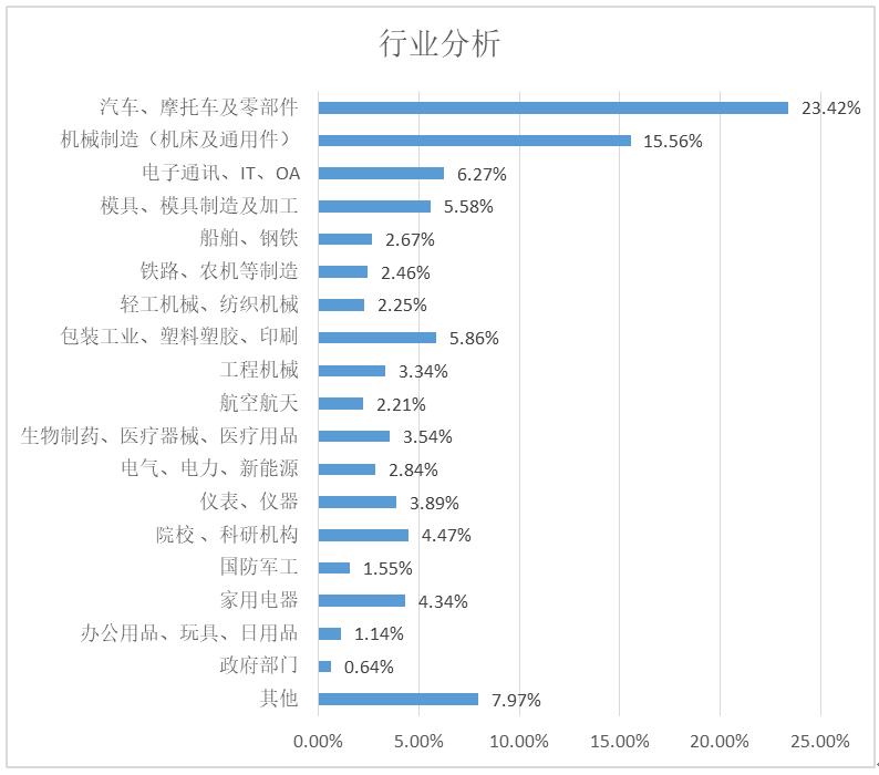 參觀展會(huì)的企業(yè)行業(yè),以汽車(chē)、摩托車(chē)及零部件企業(yè)最多,占到總數(shù)的23.42%,其次為機(jī)械制造(機(jī)床及通用件),占15.56%。此外,電子通訊、模具、船舶、鋼鐵、鐵路、農(nóng)機(jī)、輕工、橡塑包裝、工程機(jī)械、國(guó)防軍工、航空航天、生物醫(yī)藥、家電等制造行業(yè)均有涉及。